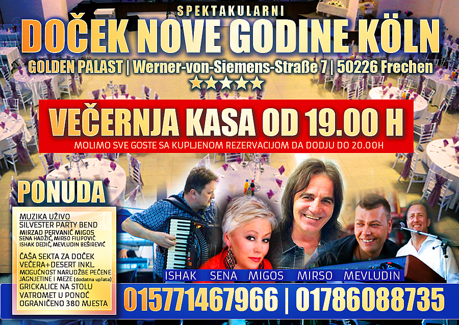 MOLIMO VAS DA ZBOG LIMITIRANOG BROJA STOLICA STO PRIJE REZERVISETE VASE MJESTO. GOSTI SA REZERVACIJOM IMAJU PREDNOST U IZBORU MJESTA OD DANA UPLATE REZERVACIJE. REZERVACIJE CEMO UVIJEK AKTUALIZIRATI NA OVOJ STANICI ". DO SKOROG VIDJENJA..DOCEK NOVE GODINE KÖLN